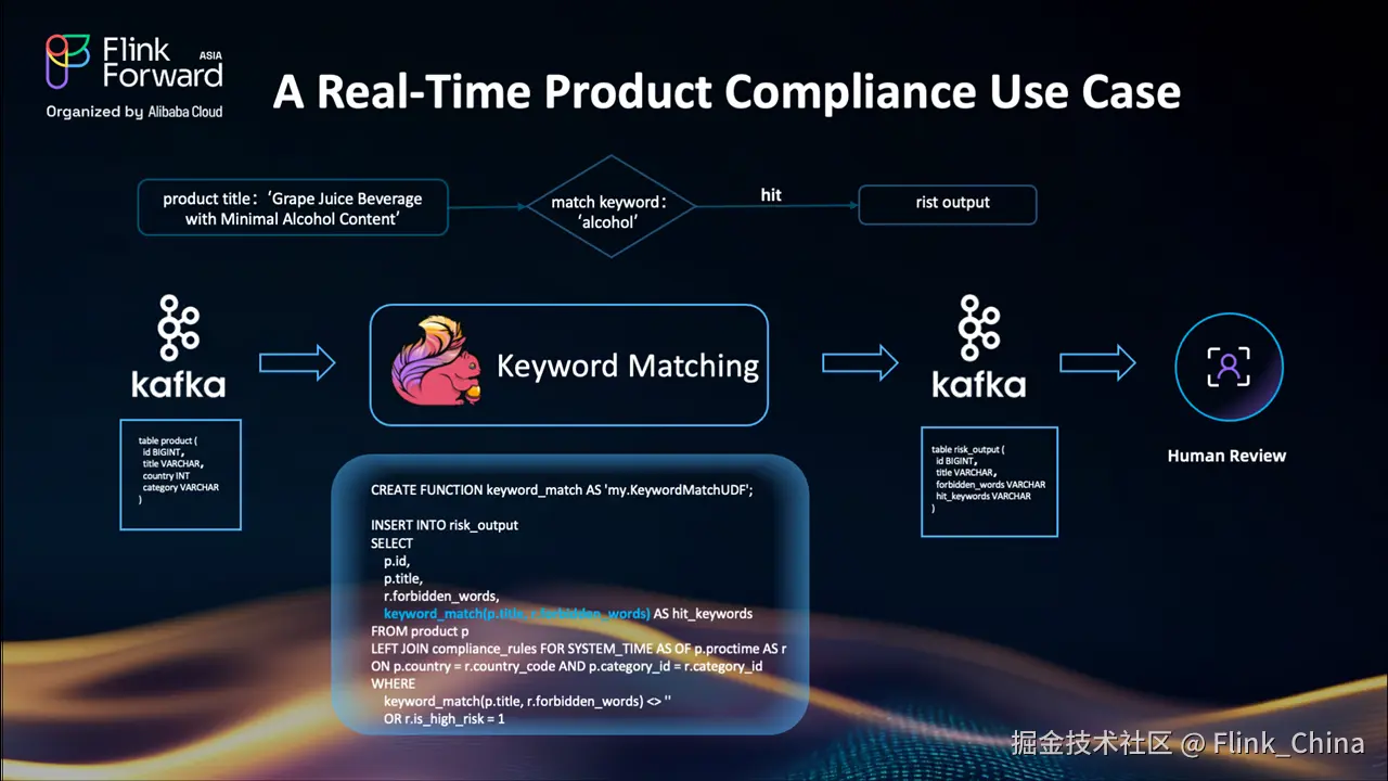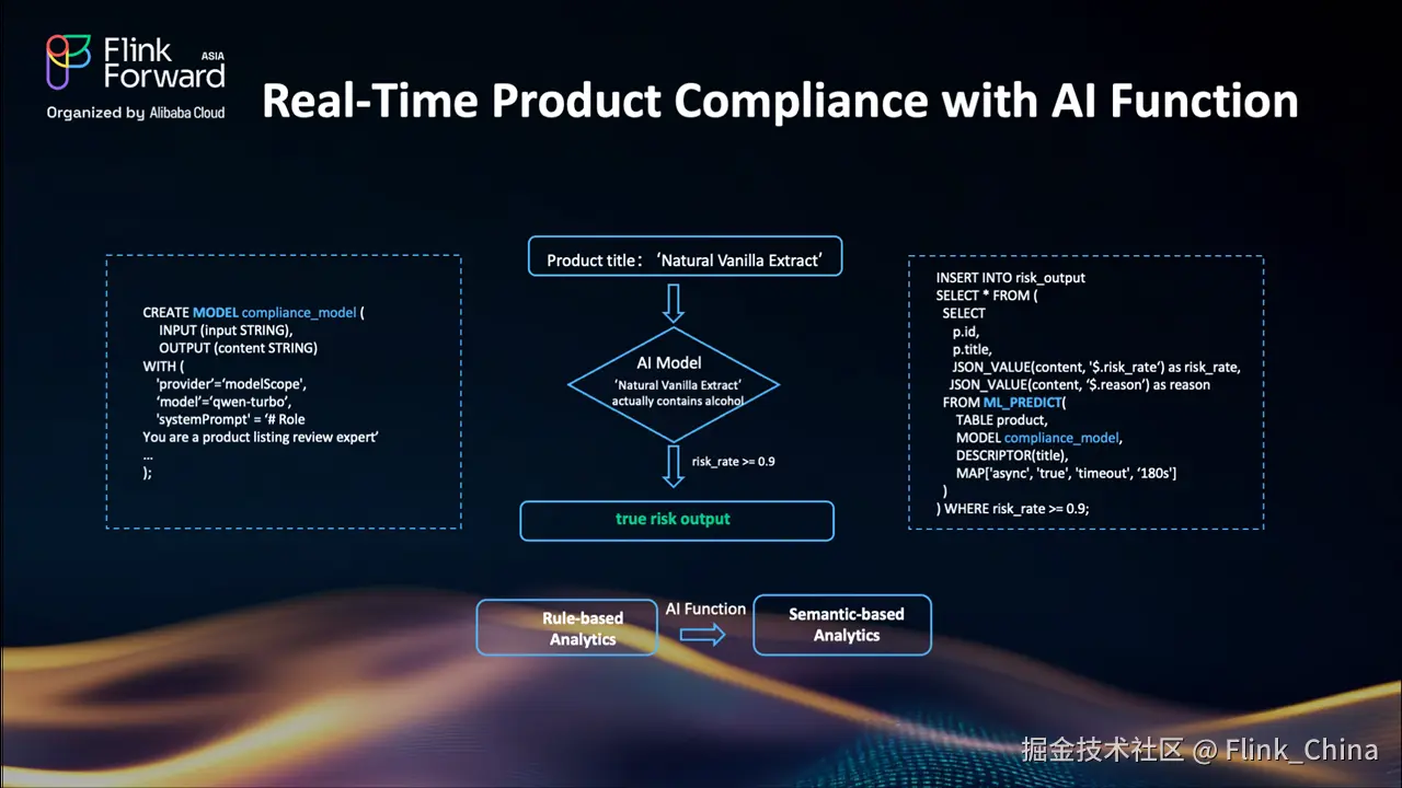 让我们通过一个具体的示例将所有内容整合在一起。以下是 Flink AI 函数如何解决我们的产品合规性挑战: