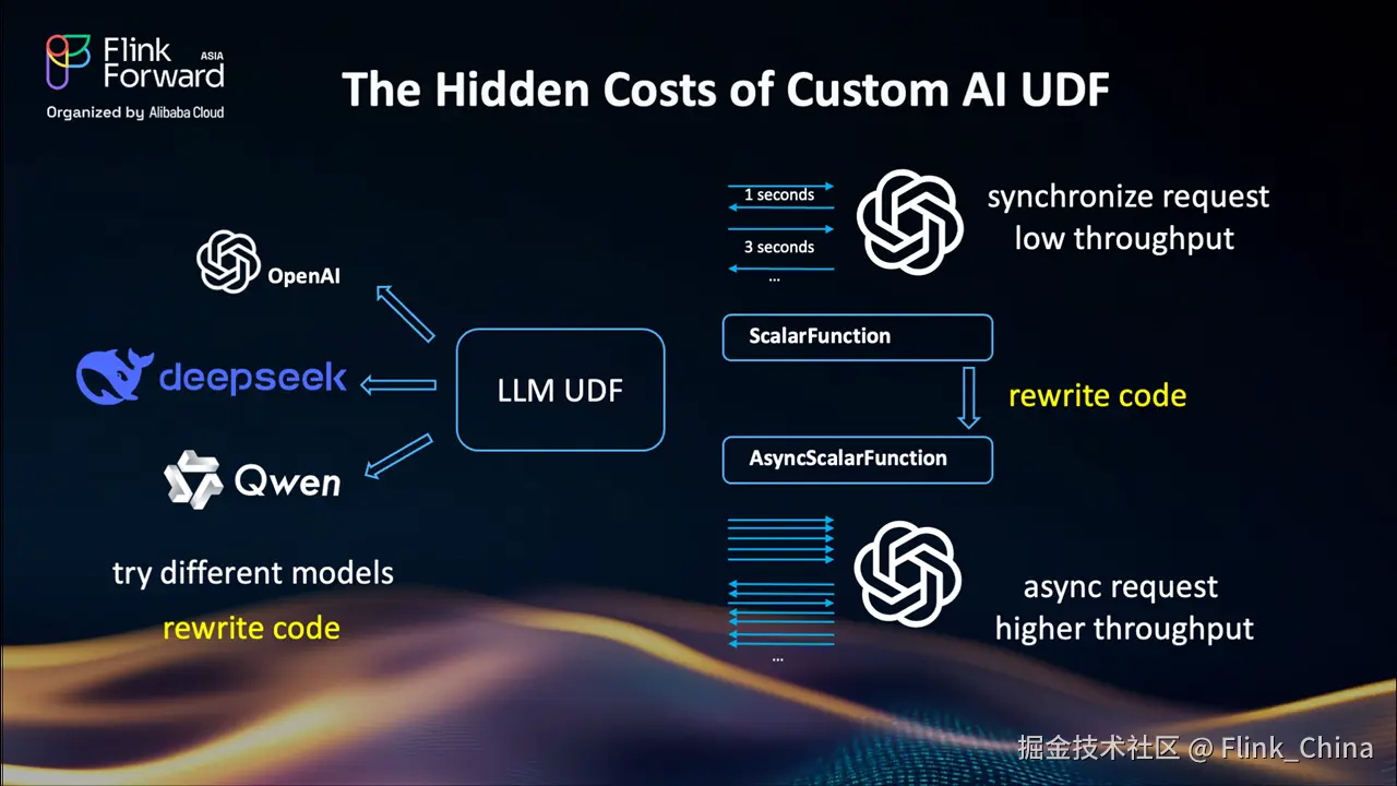 代码重写:如果我们想从 OpenAI 切换到阿里云,我们需要重写 UDF 代码。测试不同的模型?更多的代码更改。这种方法无法扩展。每次新模型或 API 更改时重写 UD F代码是不高效的。