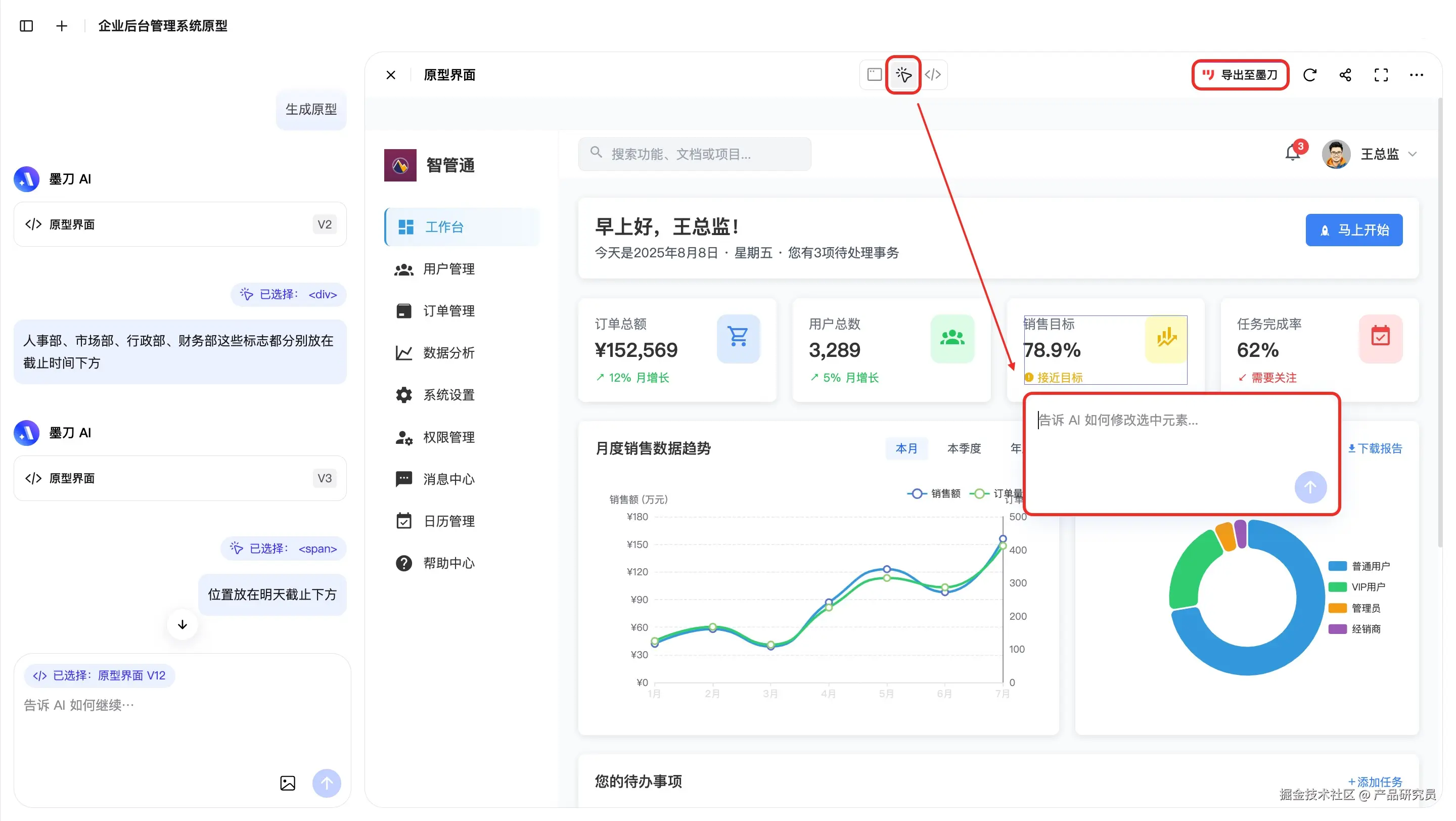 前两天我用墨刀AI生成了一个企业后台管理系统的工作台原型图,同事见了猛吃惊,整体完成度比我预想的还高,连细节也处理得不错。更重要的是,是可以导出到项目中自由编辑的。整个流程只花了几分钟,非常顺利,工作效率直接翻倍!