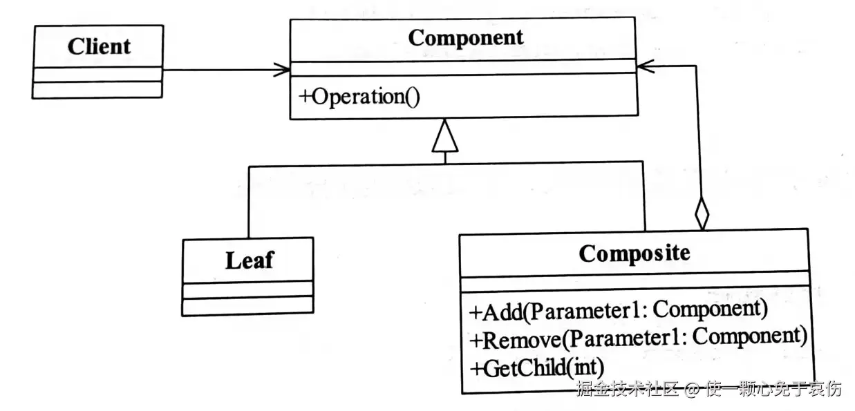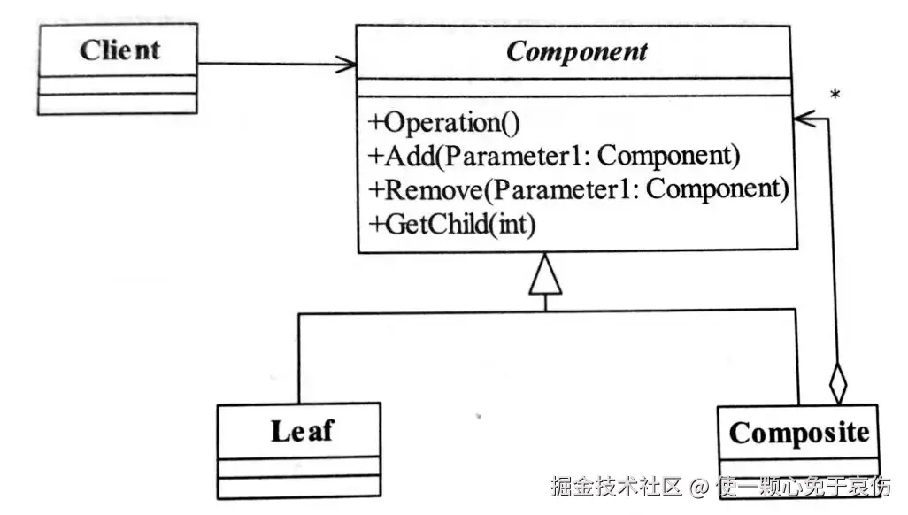 Component,抽象构件。角色定义参加组合对象的共有方法和属性,可以定义一些默认的行为或属性。