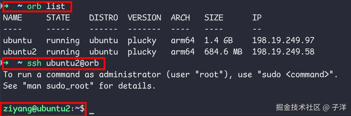通过 orb list 命令可以看到有哪些运行的虚拟机,可以通过 ssh orb 进入默认的虚拟机中。