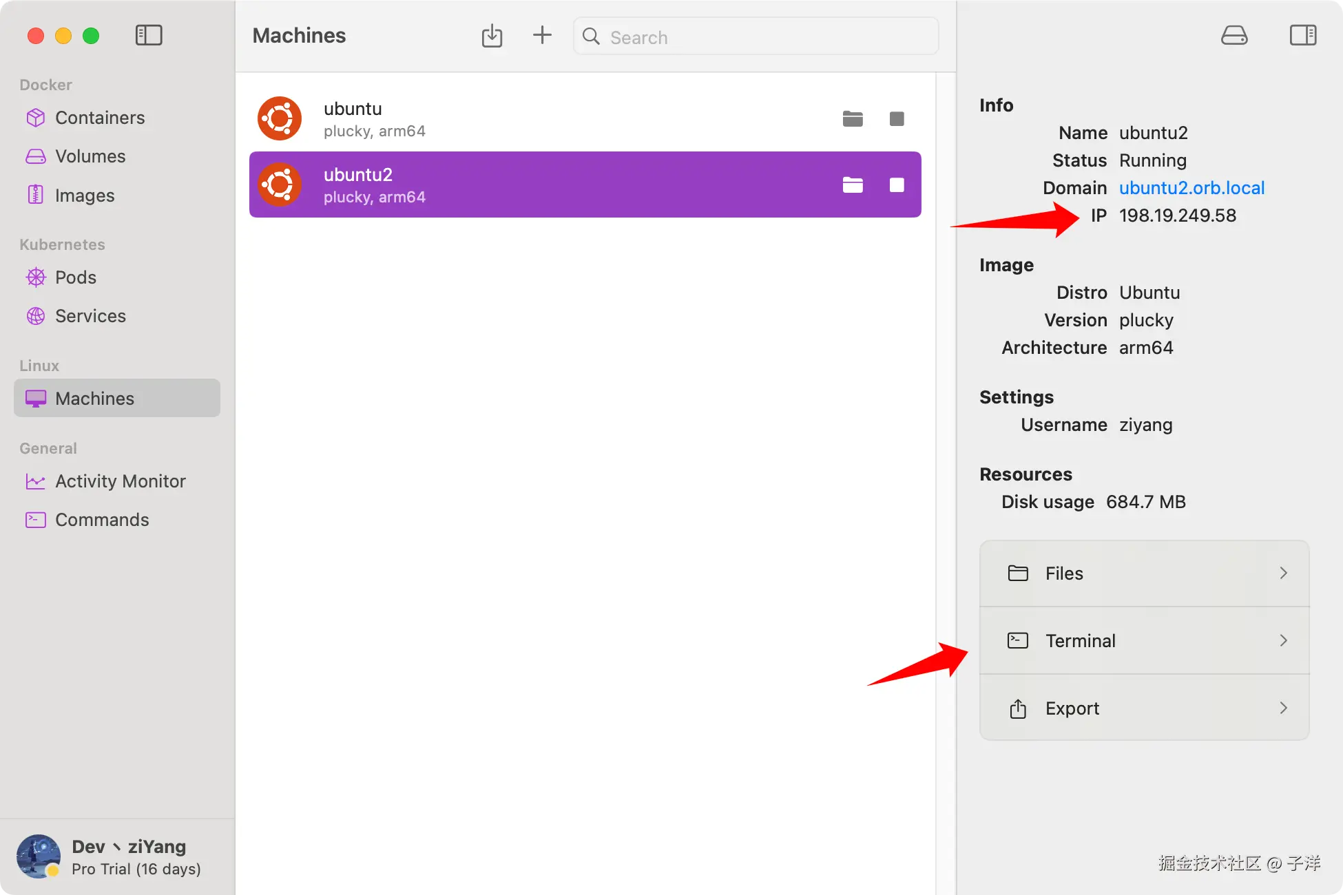 在 OrbStack 中,除了可以直接使用 IP 地址 连接虚拟机外,还可以使用它提供的 Domain 进行登录。相比 IP,Domain 的优势在于它是固定的,不会因为虚拟机重启或网络变化而改变,从而避免终端中保存的 SSH 连接因 IP 变动而失效的问题。
