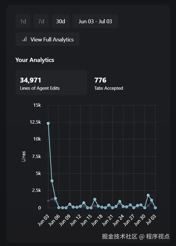 之前开通了年度Pro版会员,正常每个月有500次高速访问,从配图一中可以看到,6月3号的时候,Agent编辑的代码行数为12.5k行,那段时间我不论什么问题都想着扔给Cursor,比如是很简单的问题,又或者是复制粘贴个文件的事情,反正自己是恨不得一行代码都不写。