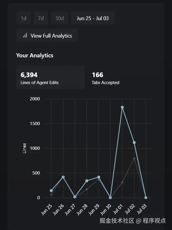 结果也是在那段时间里,Agent编辑的代码行数维持在比较低的水平中,显然大幅度提高了效率。总之,高级模型的快速请求要选择性的用,好钢要用在刀刃上。