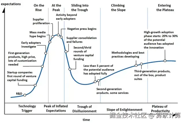 此外,用户心理预期的变化也是原因之一。Gartner 提出的技术成熟度曲线(Hype Cycle)表明:任何新技术在诞生后,都会经历“技术触发”“期望膨胀的峰值”“幻灭低谷”“稳步爬升”和“成熟期”几个阶段。