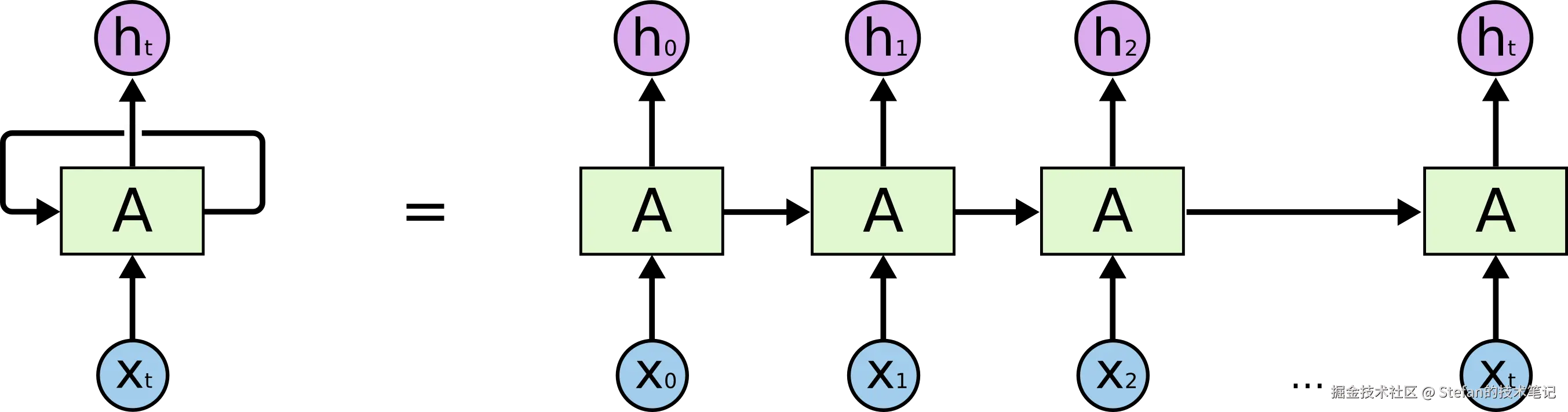 为了克服n-gram的局限,研究者们将目光投向了神经网络。循环神经网络(RNN)应运而生,它被设计用于专门处理序列数据。RNN的革命性在于引入了隐藏状态的概念,在每个step中,RNN不仅处理当前的输入,还会接收来自上一步的隐藏状态,就好像拥有了短期记忆。理论上,这个隐藏状态可以编码从序列开始到当前位置的所有信息,这就让模型第一次有了捕捉上下文的能力。