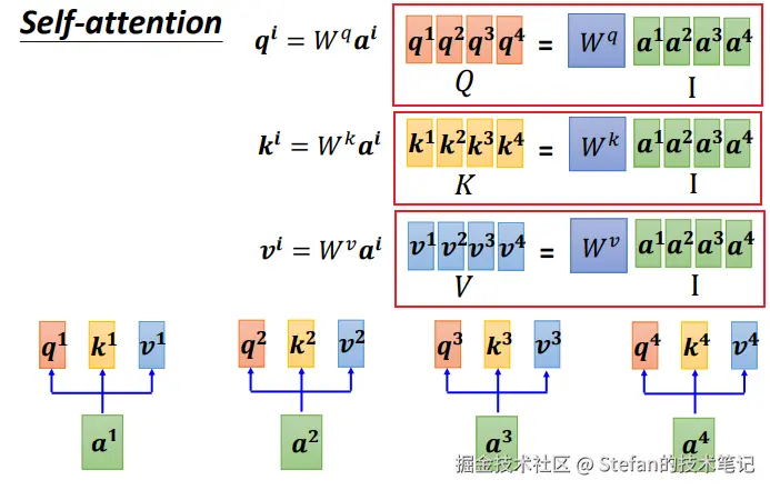 那么模型在技术上是如何实现的呢?它为输入序列中的每个词都生成了Q、K、V三个不同的向量。