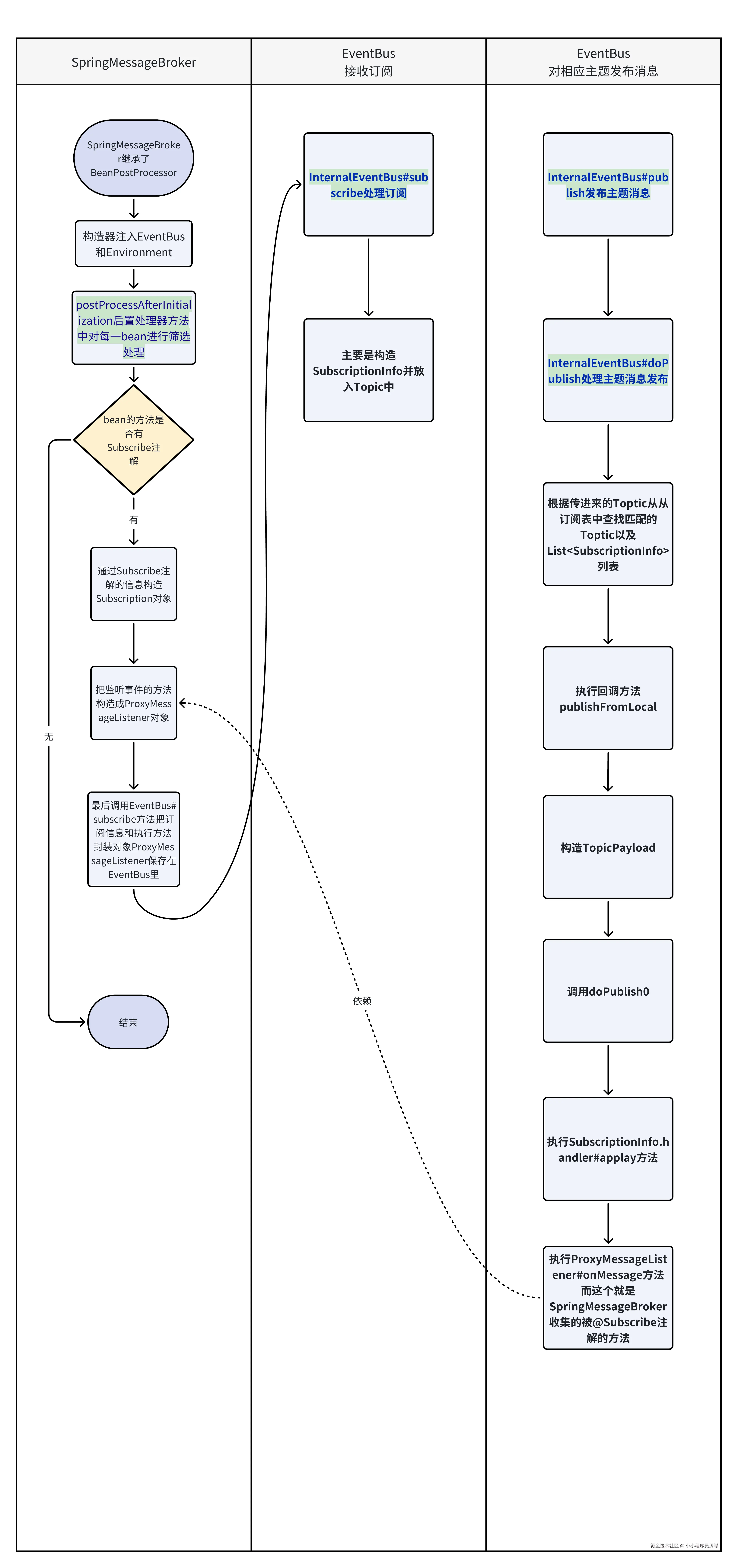 EventBus 的大致处理流程如下:其实思路和Spring 的处理思路也很类似,就是在容器加载的时候收集所有被@Subscribe注解标注的方法,并把这些方法构造成订阅关系模型,之后保存到 EventBus的内存中,之后在EventBus 发布消息的时候,通过匹配Toptic ,找到相应的订阅关系模型,这个模型里存储有相应的 订阅方法,之后调用即可