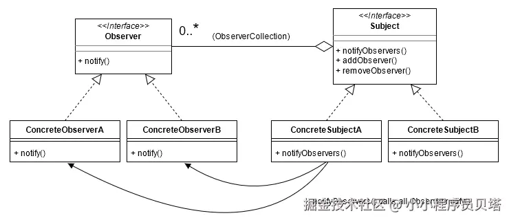 观察者模式UML如下,Subject充当被观察者的角色,在其内部会聚合0或者多个Observer(观察者列表) ,并在被观察者 Subject 内部状态发生变化时通过 notifyObservers() 方法调用 观察者的 notify() 方法,从而实现了 被观察者状态变更实时通知到观察者, 从依赖关系上看是一种比较强或者说比较直接的依赖关系在观察者与被观察者之间。