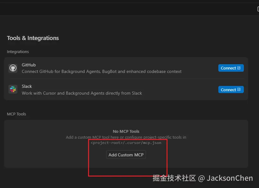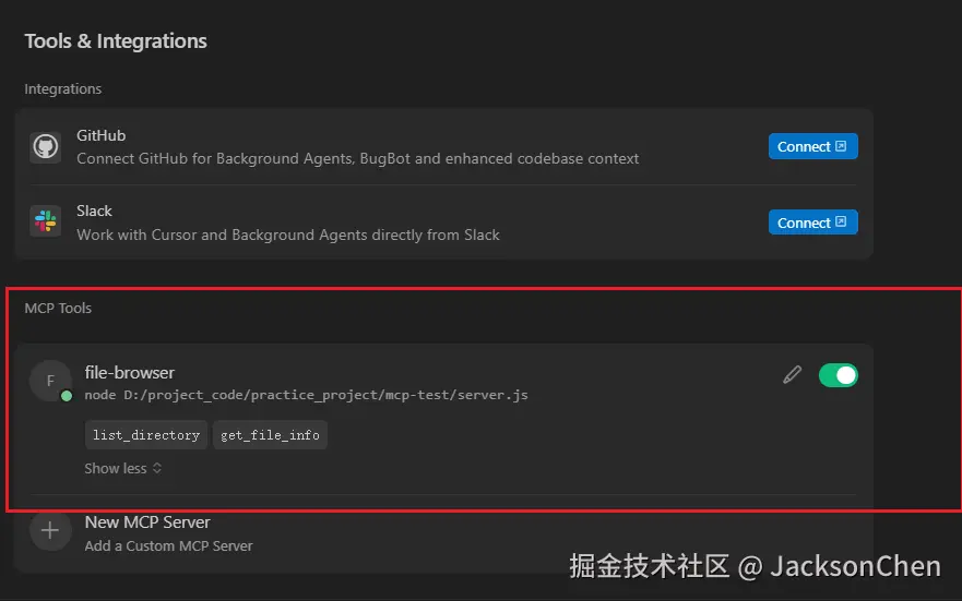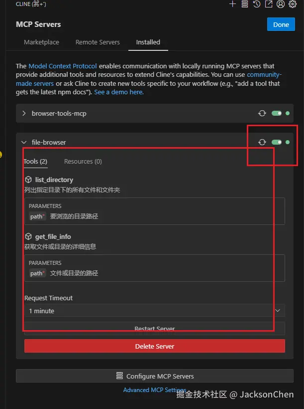 可以看待右侧的 switch 为绿色就代表 mcp 安装成功了,一共有两个 tool,也就是刚刚代码里注册的list_directory 和 get_file_info。