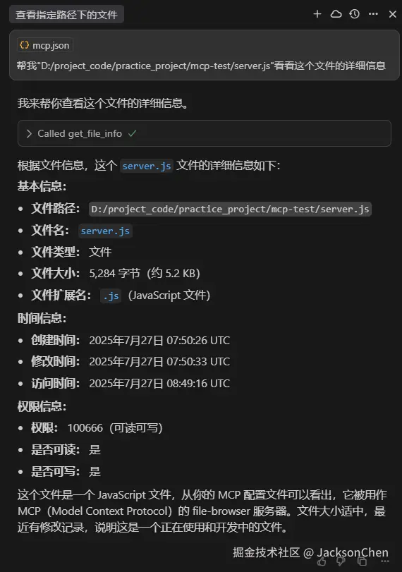 可以看到大模型调用了我们写的 MCP Server,get_file_info,并且成功的输出了出来。