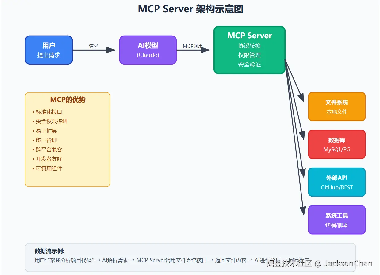 这样设计的好处是,AI 不需要直接访问你的文件系统,而是通过MCP Server这个受控的中介,既保证了功能性,又维护了安全性。