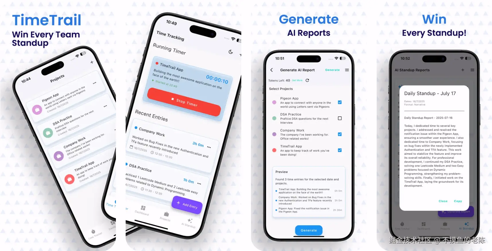 TimeTrail是一款时间管理应用,帮助用户记录工作内容和成果,并生成专业的Standup汇报,提升工作可见性和效率。