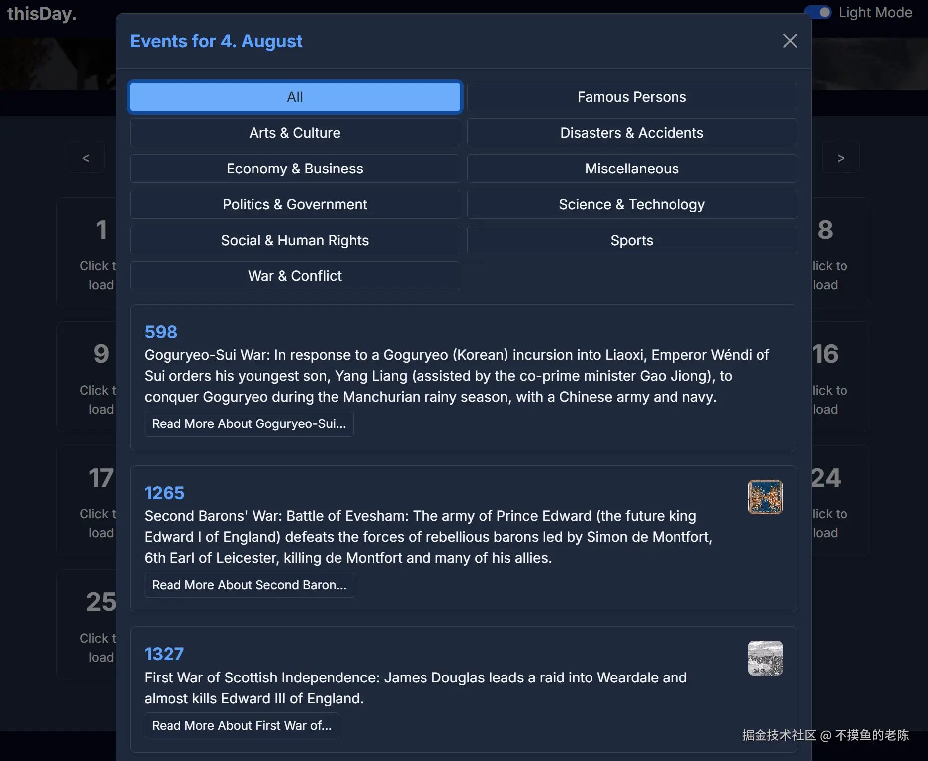 thisday是一个历史交互式日历网站,通过Wiki API收集历史事件,用户可以选择日期查看事件时间线,并使用聊天机器人辅助导航。