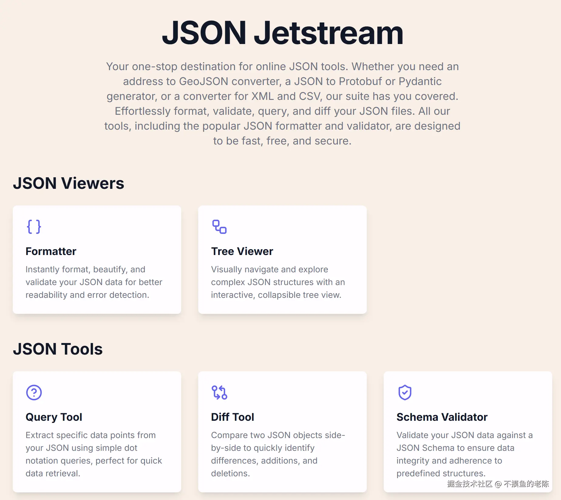 JSON Jetstream是一款在线JSON工具,简单、快速且直观,旨在轻松处理JSON数据,包括格式化和错误检查功能。