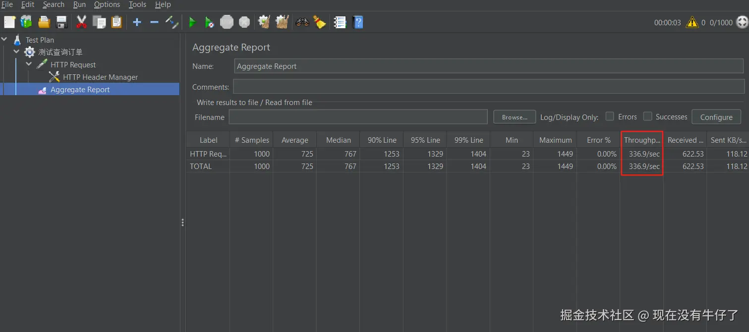 场景示例:查询订单列表,通过接口获取redis缓存中的数据,使用JMeter模拟1000个请求,第一次演示缓存未过期的情况,第二次演示过期的情况,通过观察后台以及JMeter展示的吞吐量获取两次请求的区别。