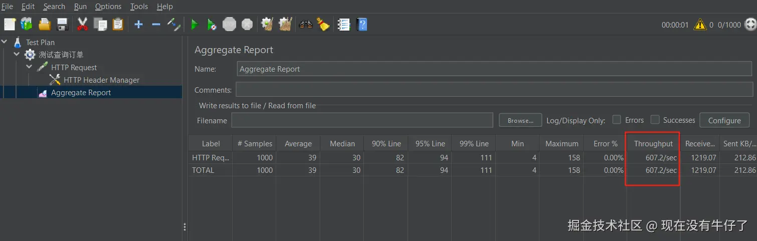 假设redis中已经缓存了订单列表数据,使用JMeter测试请求,并发数1000: