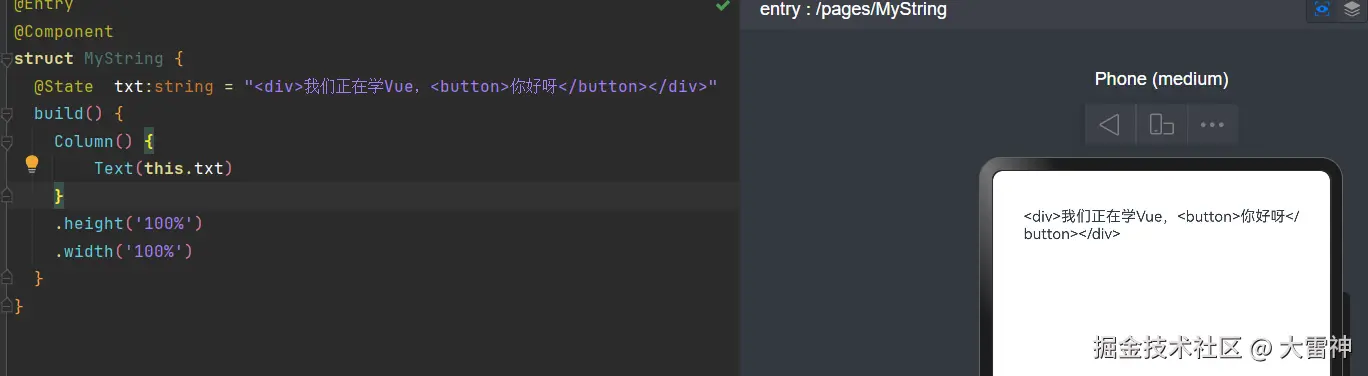 @State txt:string = "<div>我们正在学Vue,<button>你好呀</button></div>"
