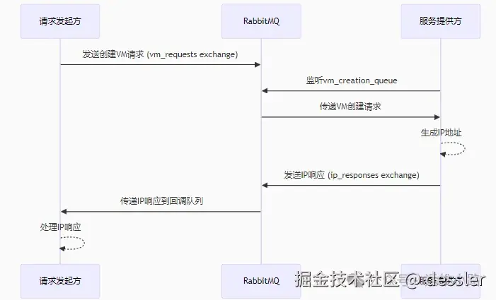 请求发起方:发起创建虚拟主机的请求,然后他需要去申请网络资源,他会把这个请求发送到MQ的交换机里面,并且监听另外一个队列,从这个队列里面获取IP信息。