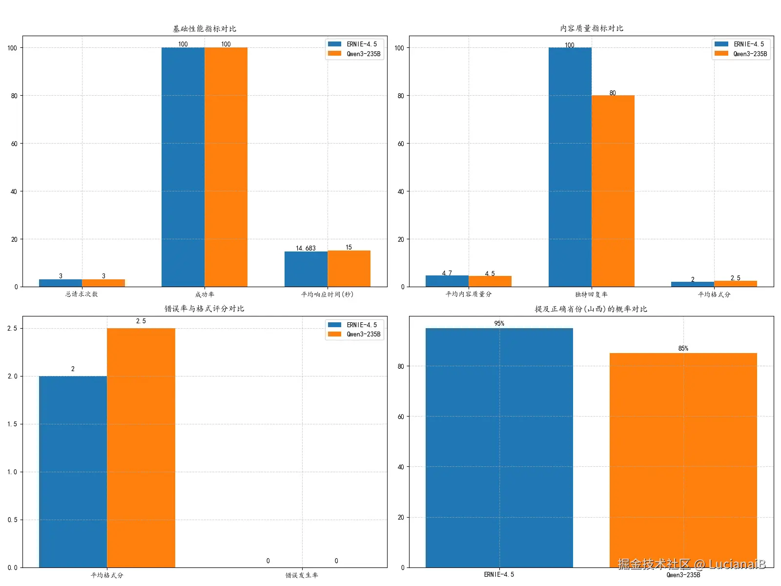 - ERNIE-4.5平均响应时间略快(14.683秒 vs 15秒),但差异不显著