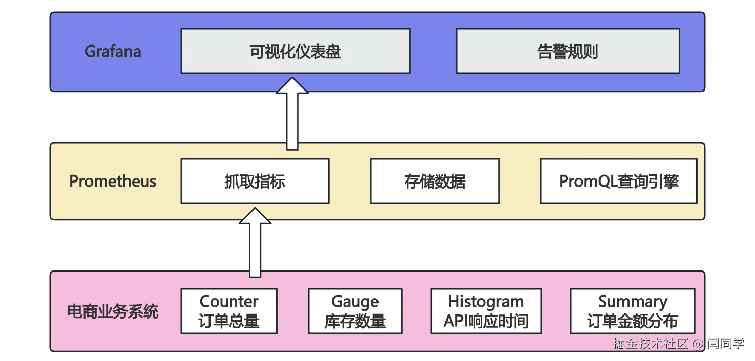 这时候,Prometheus的四大指标类型就派上用场了!让我们通过一个真实的电商系统来搞懂它们。