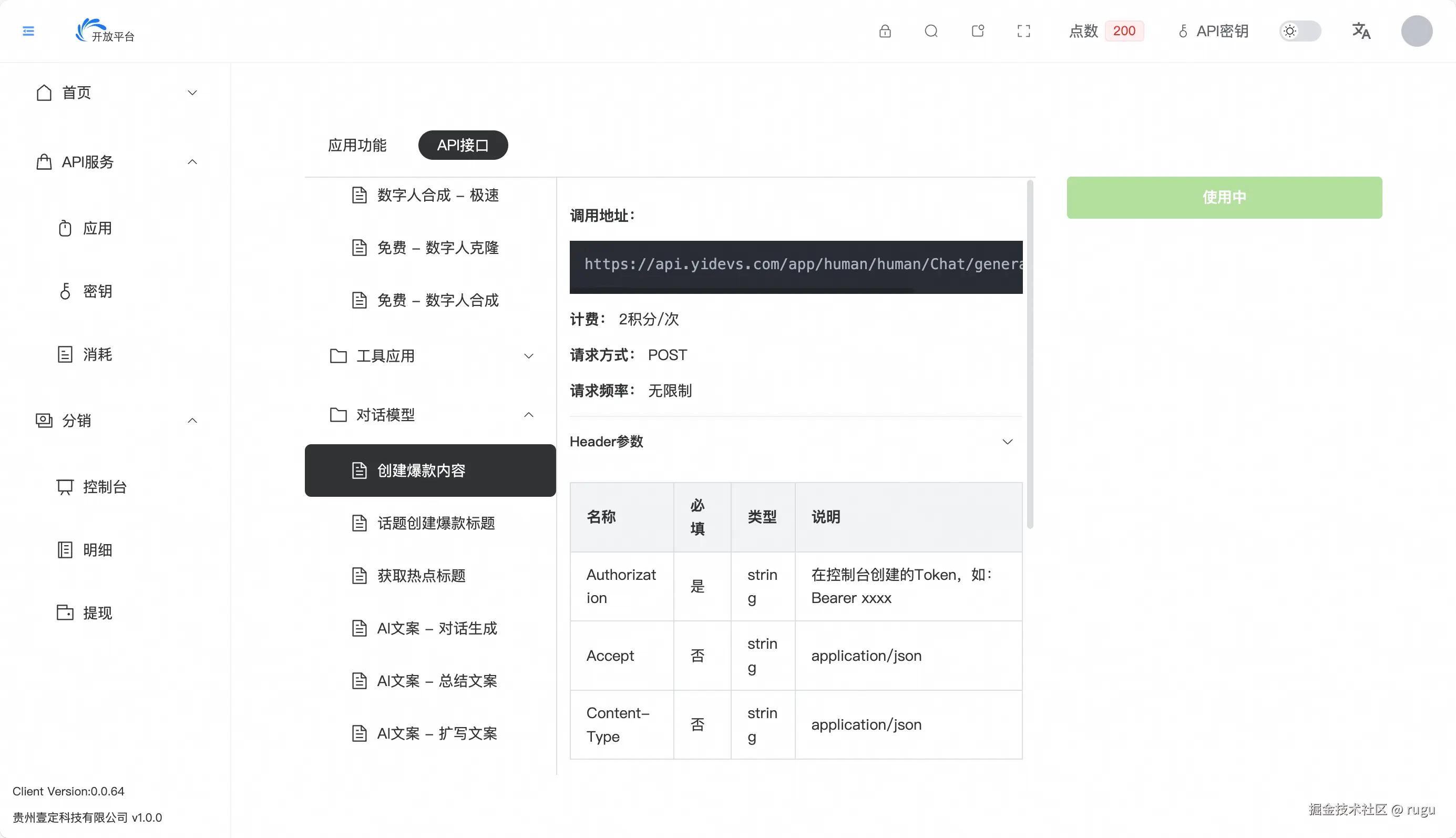 我这里以一个创建爆款内容的接口为例,演示如何调用接口