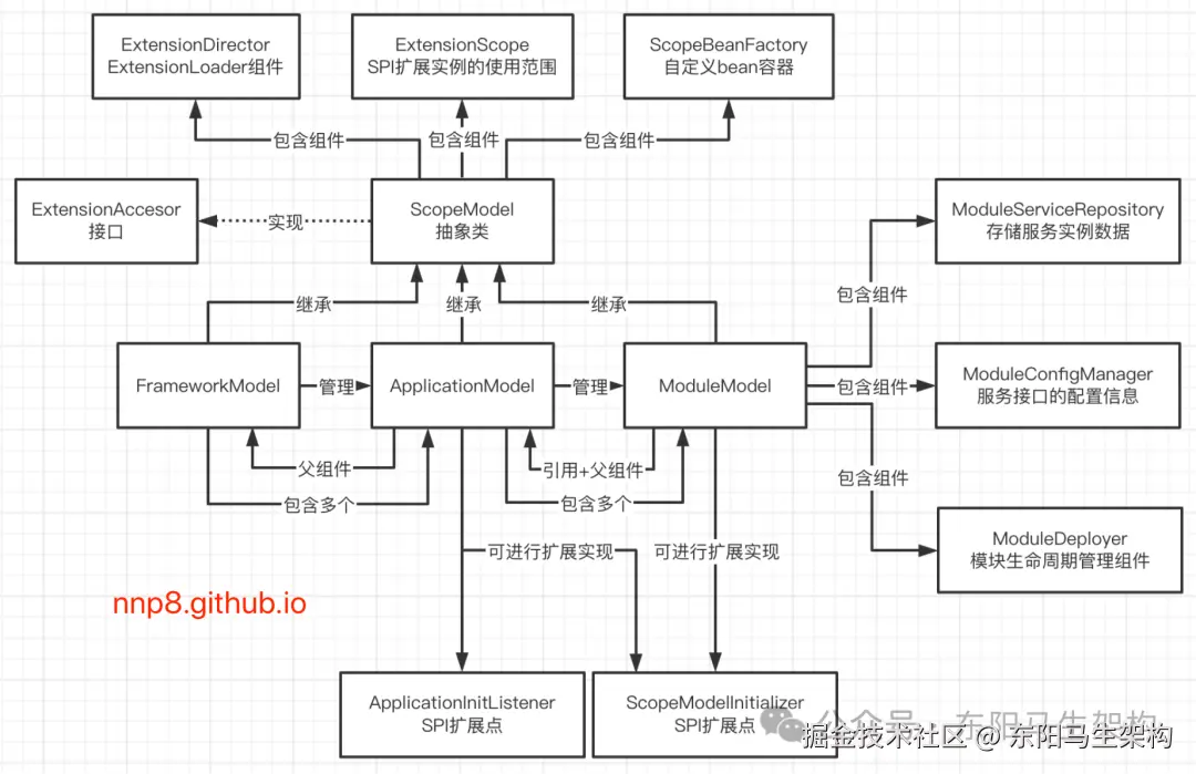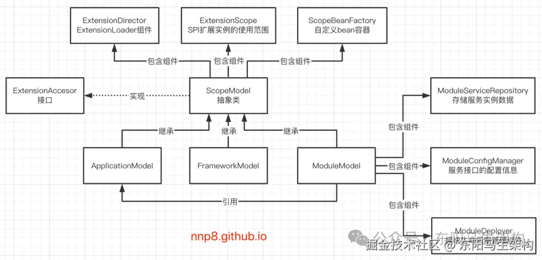 需要注意的是:Dubbo3里有一个model组件体系,其中ScopeModel是基础。ScopeModel类型可以转换为ModuleModel、ApplicationModel。