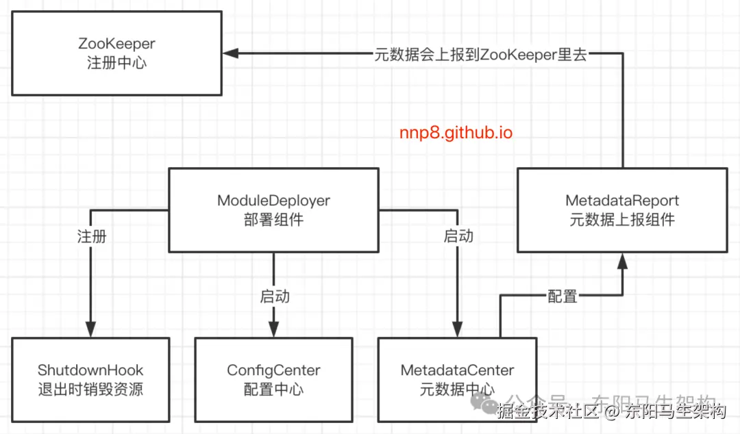 Dubbo服务实例内部会有很多的代码组件,通过ModuleDeployer便可以避免零零散散的去调用和初始化。ModuleDeployer会对服务实例的启动做很多的初始化准备工作,比如会对MetadataReport组件进行构建和初始化以及启动(建立跟zk的连接)。