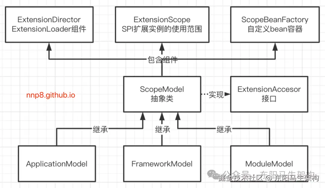 ScopeModel是model组件体系里最顶层的抽象父类,ScopeModel实现了一个关键接口ExtensionAccessor。ExtensionAccessor就是extension(SPI扩展实现类)的访问器,其中Accessor有访问器之意,所以ExtensionAccessor可以理解为是一个获取extension的组件。如果一个类实现了ExtensionAccessor接口,则随时可以获取指定接口的扩展实现类。