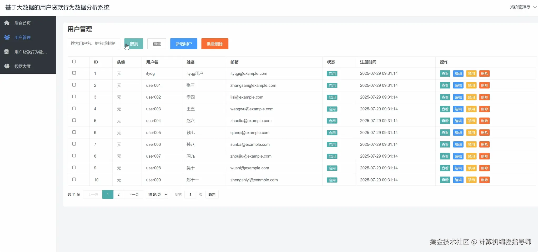 本课题的研究具有重要的理论价值和实践意义。从技术层面来看,基于Hadoop+Spark的用户贷款行为数据分析系统为大数据在金融风控领域的应用提供了完整的解决方案,验证了分布式计算框架在处理海量金融数据时的有效性和可行性,为相关技术的进一步发展和优化提供了宝贵经验。从实践应用角度分析,该系统能够帮助金融机构建立更加精准的风险评估模型,通过对用户多维度行为特征的深度分析,显著提升贷款审批的智能化水平和风险识别准确率,有效降低坏账率和经营风险。对于整个金融行业而言,这种数据驱动的风控模式推动了传统金融业务的数字化转型,提升了行业整体的风险管理水平和服务效率。同时,该系统的成功实施也为其他金融科技应用场景提供了参考范本,促进了大数据技术在更广泛金融业务中的推广应用。值得关注的是,通过构建完善的用户信用画像和风险预警机制,不仅保护了金融机构的资产安全,也为诚信用户提供了更加便捷高效的金融服务体验。