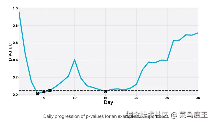 5)天生渴望快速得到答案,但 A/B 测试最忌讳的正是“频繁检查结果并提前终止”。 展示的 AA 测试(即对照组与对照组对比)清晰揭示了这一风险:在连续 7 天的监测中,p 值会随机波动,甚至出现 4 次“显著”信号(p<0.05),但这纯属概率问题。若在此时误判为“发现差异”并停止测试,就等于掉入了 P-hacking 的陷阱。