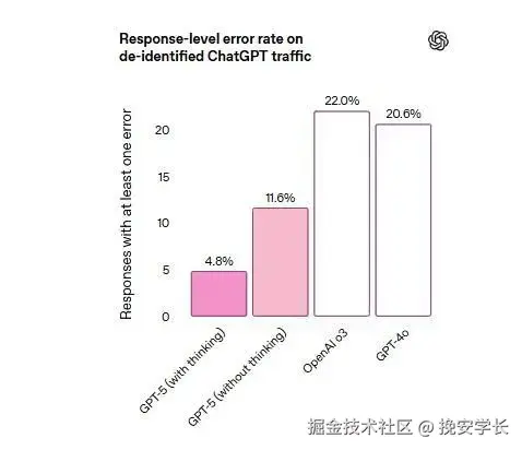 OpenAI给出了一组更贴近生产环境的评估:对代表ChatGPT生产流量的匿名提示开启联网搜索后,GPT‑5含事实错误的概率比GPT‑4o低约45%;在“思考后”,比o3低约80%。对外展示的对比图里,GPT‑5错误信息率为4.8%,GPT‑4o为20.6%,o3为22%。