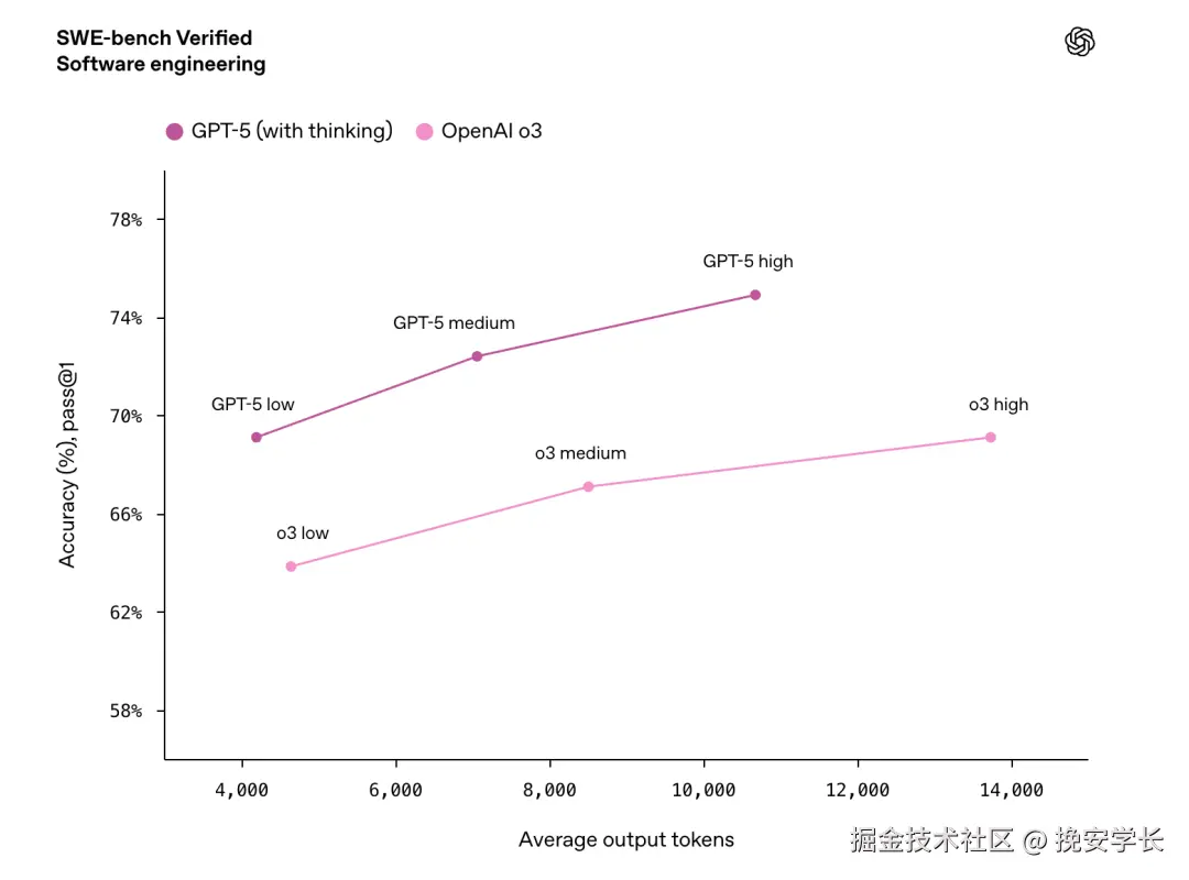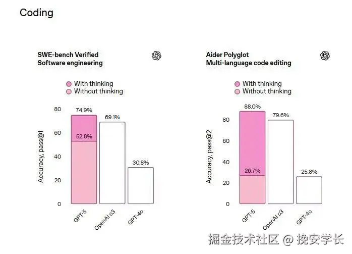 在来自GitHub真实任务的SWE‑bench Verified上,GPT‑5(思考后)首次尝试准确率达74.9%,高于o3的69.1%与GPT‑4o的30.8%;对比同代竞品,略高于Claude Opus 4.1(74.5%),显著高于Gemini 2.5 Pro(59.6%)。