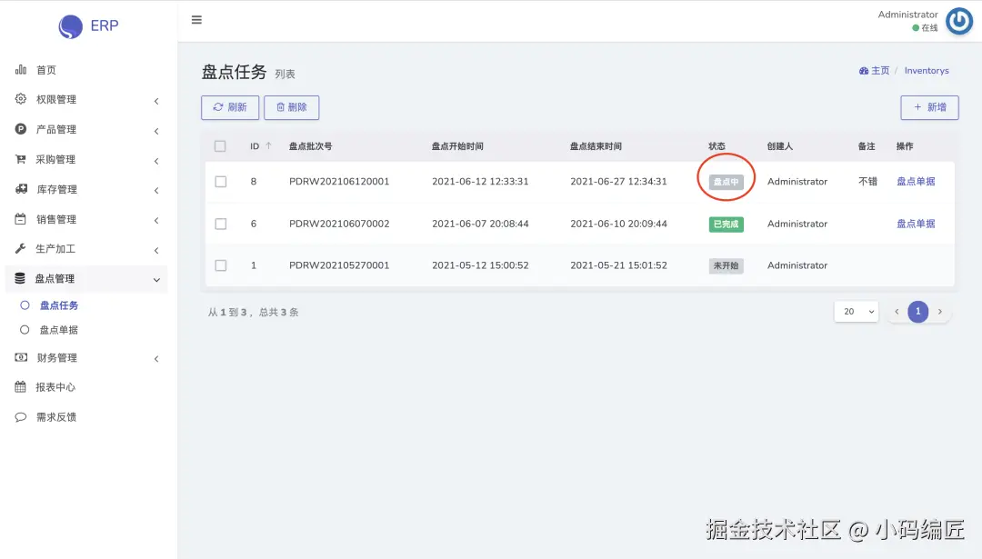 盘点单据: 选择需盘点的库存数据,录入实际盘点数量,审核完成盘点。可删除非"已完成"状态的盘点数据。