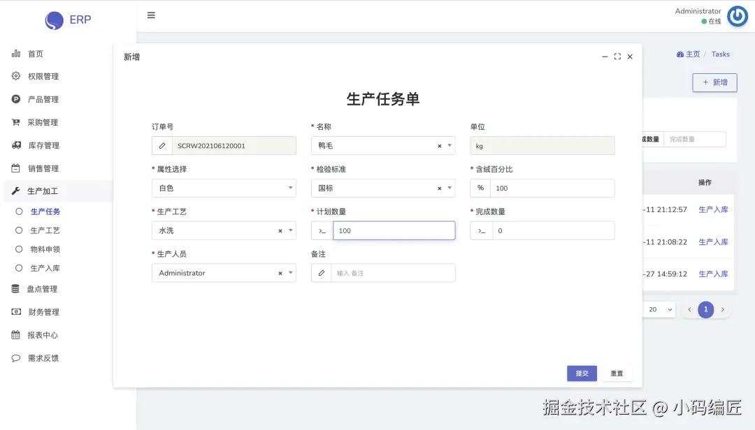 生产入库: 仅当生产任务下所有物料申领单审核完成(状态变为"已领料")后,方可进行。系统自动计算入库成本:成本 = 物料申领总成本 / 生产入库数量。