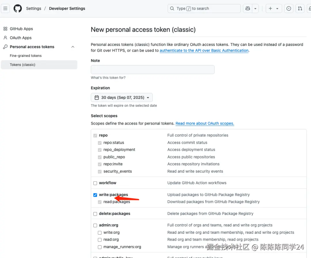 首先需要新建一个Github Token,然后勾选write:packages权限,创建Token的URL: