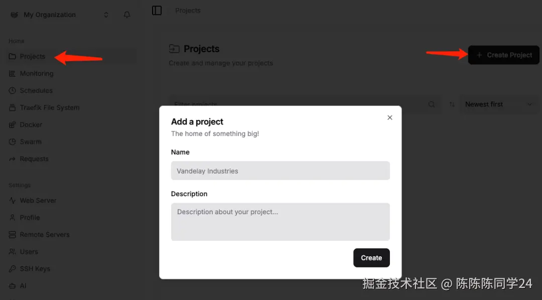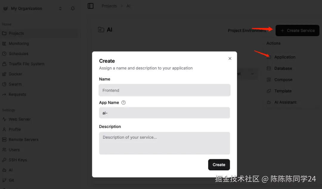 在Dokploy管理后台的Projects中先创建Project再创建Service,Service才是对应的Vercel中的项目,Dokploy的Project下可以有多个Service。