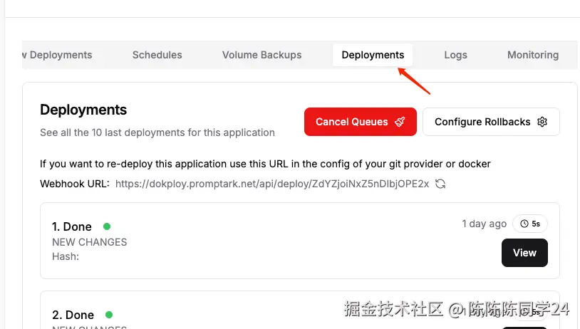 然后可以在Deployments中查看是否部署成功,以及如果部署失败的日志。