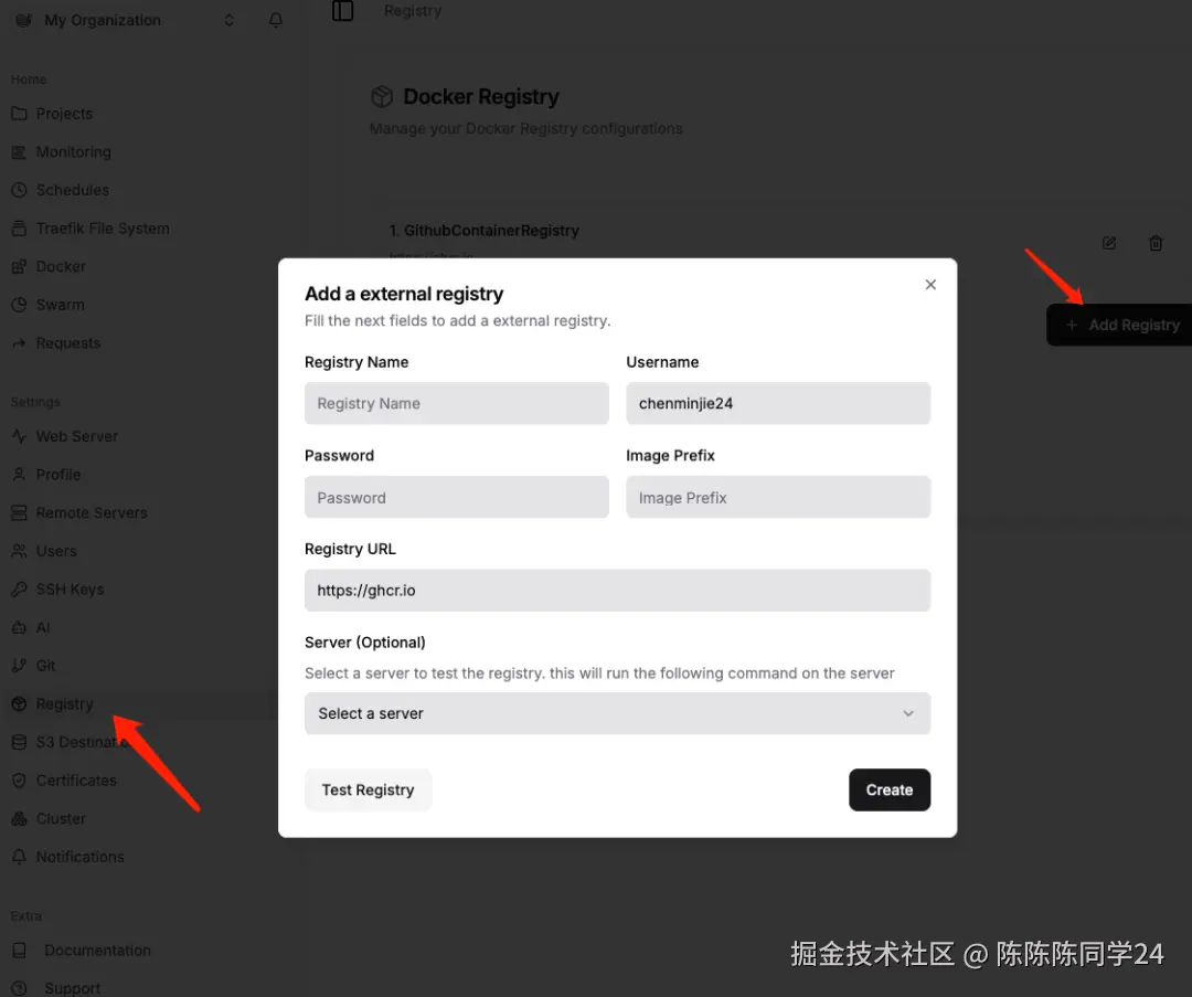 接下来还需要配置一下Github token和Registry,这个配置是为了让Dokploy能从Github拉取你使用Github Actions构建的镜像进行部署,推荐使用这种方式,这样可以避免使用你的服务器进行打包镜像,减轻你服务器的压力,要是你服务器很屌可以不用操作这个配置,直接在服务器上构建部署就行。