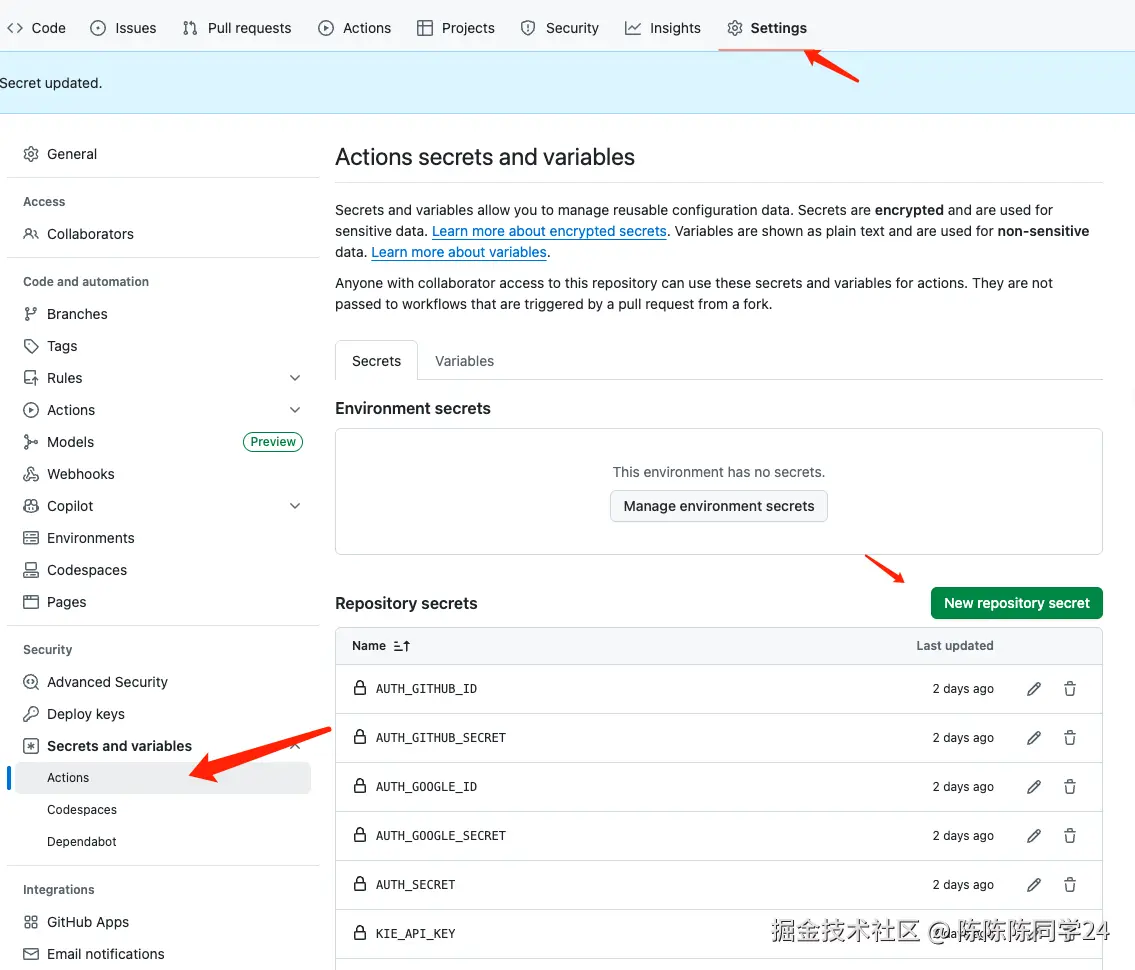 - 构建镜像时的build-args,如果你没有NEXT_PUBLIC_*变量需要设置可以删去,如果有就修改成你自己的变量名,并在Github对应仓库的settings中增加secret变量