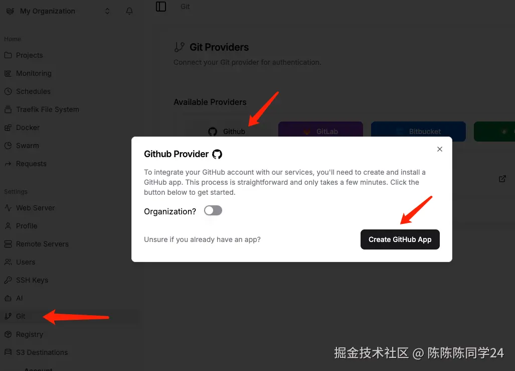 点击左侧的Git菜单,选择Github,点击创建Github App。