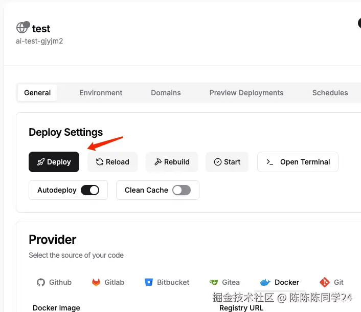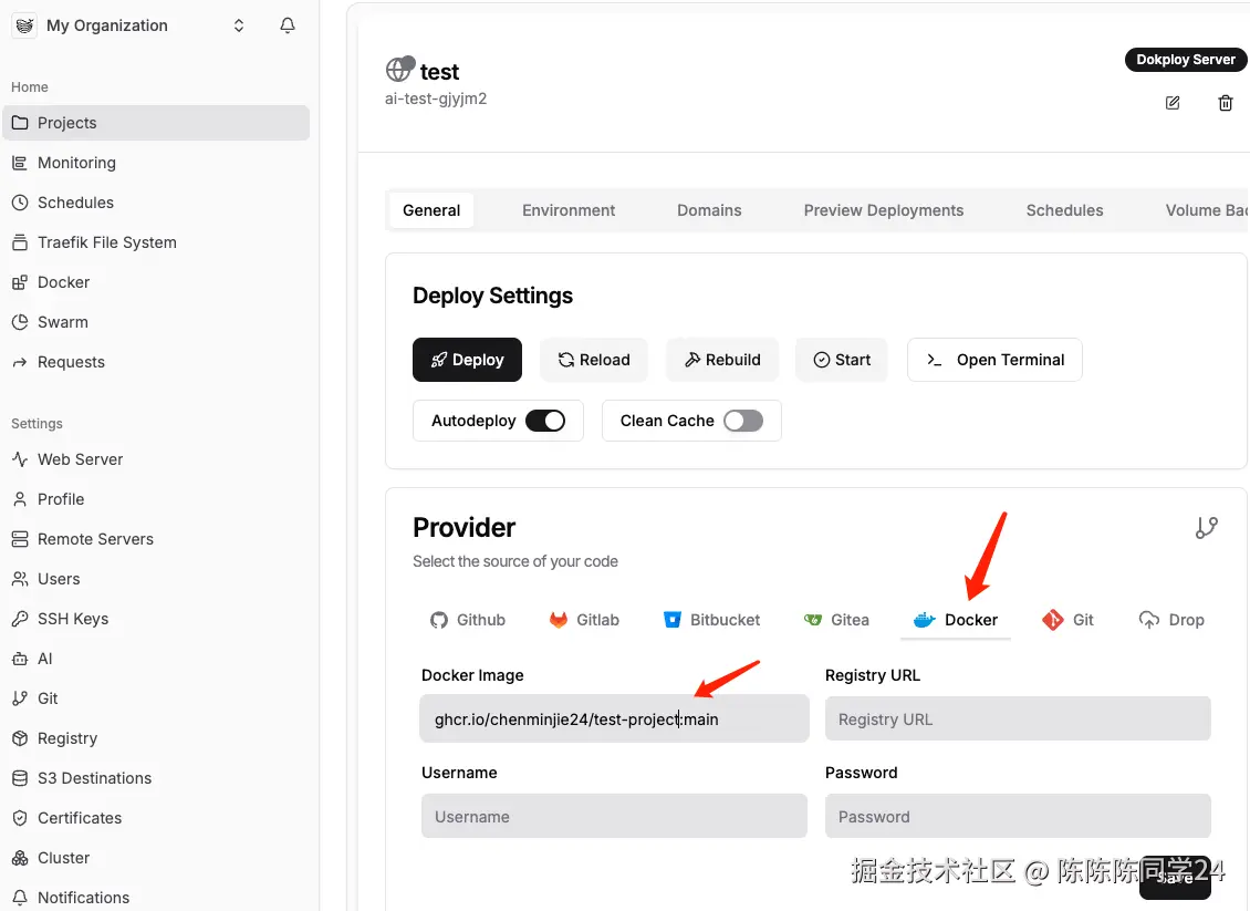 接下来就可以在Dokploy进行部署了。 打开需要部署的项目,Provider选择Docker,Docker Image参数填:ghcr.io/[Github账号名]/[Repository项目名]:[分支名]