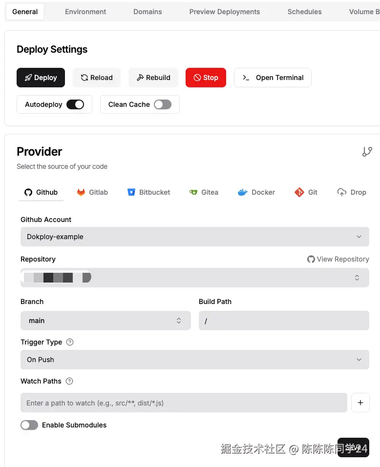 如果你的服务器配置比较好,也可以直接使用Dokploy进行部署。 打开项目,Provider选择Github,Github Account选择之前配置的账号,Repository选择要部署的仓库。