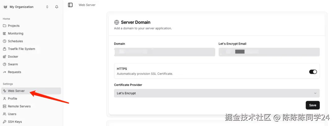 如果不想通过ip访问也可以绑定域名,点击左侧的Web Server设置你的域名即可,这个地方可以使用你某个域名的子域名即可。