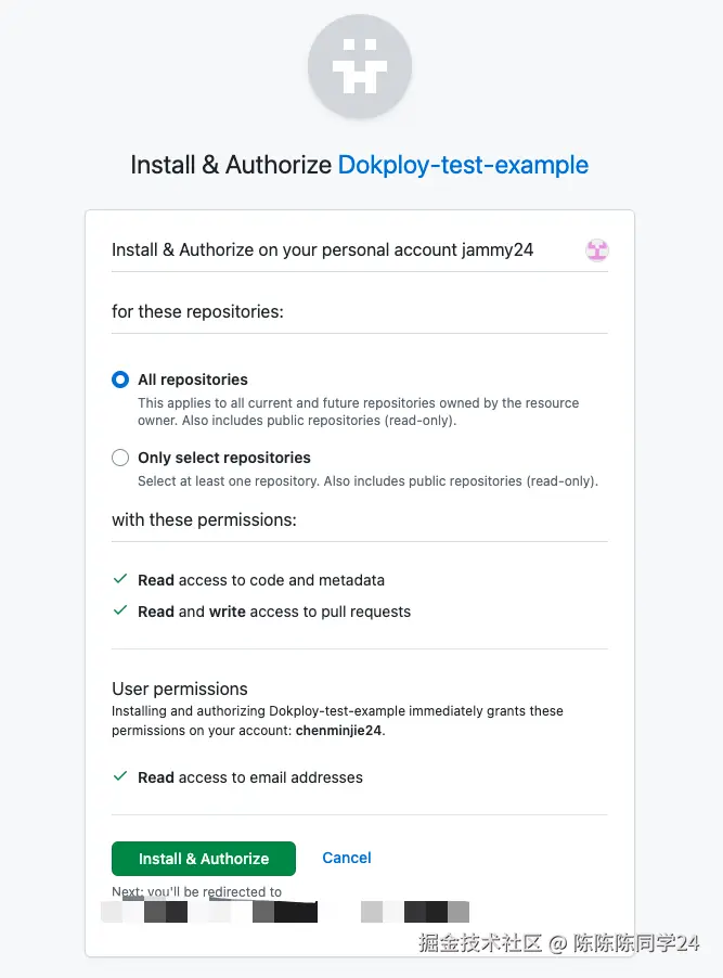 创建完成后,点击去授权,并选择你需要的仓库或者所有仓库,这样Dokploy就能获取Github的代码仓库了。