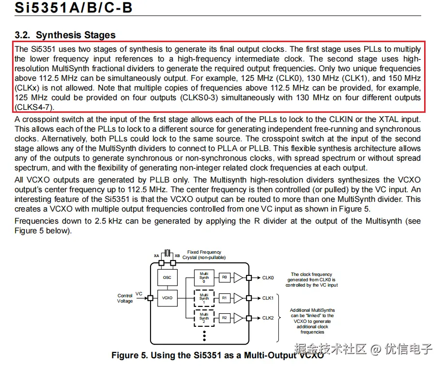 由上面的功能框图可知,SI5351A包括PLL+MultiSynth(多合成分频器)+输出R分频器,每个通道都有一个独立的多合成分频器和R分频器。此外,还内置了一个工作频率为 25 MHz 或 27 MHz 的普通振荡器电路,但它需要一个外部晶体。PLL由三个主要电子电路组成:相位比较器、VCO 和反馈分频器(FMD)。对于 FMD 的每个不同编程设置,VCO 将产生不同的频率。