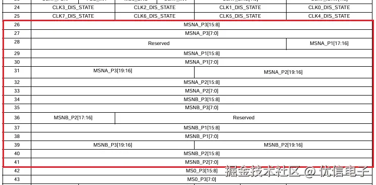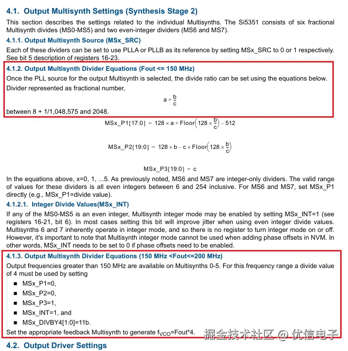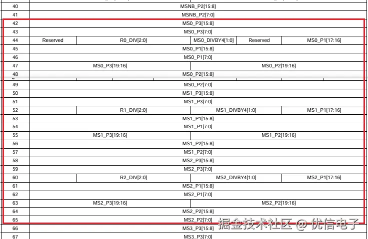 地址42~91:配置Multisynth 分频器(设置输出),也是 P1/P2/P3 三段式分频,要求 R_DIV 分频值在 4~900 且必须为偶数