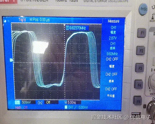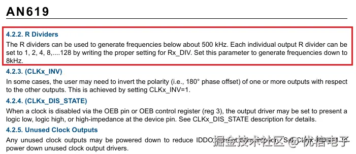 输出频率没有问题。如果输出频率低于500KHz,就要使用R分频,重复上面步骤,变换公式,将有效R值(1,2,4,8,...,128)代入即可。如果想要SI5351A产生最低频率,边界频率就要设置为2048,R分频设置为最大128。 最低输出f_{out}={VCO}/{OMD·R}={600MHz}/{2048·128}≈ 2.288KHz