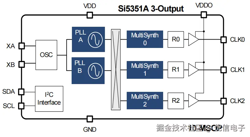 - 内部结构:内部 PLL x2、MSynth x3、分频器、R-divider