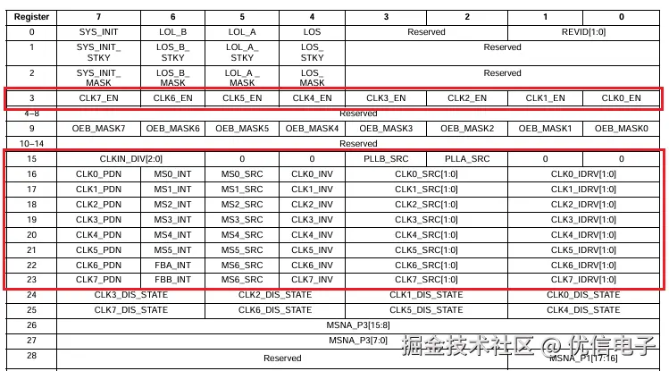 地址3:配置输出使能控制,地址1523:配置外部时钟输入分频,每路输出开关,通道时钟源等